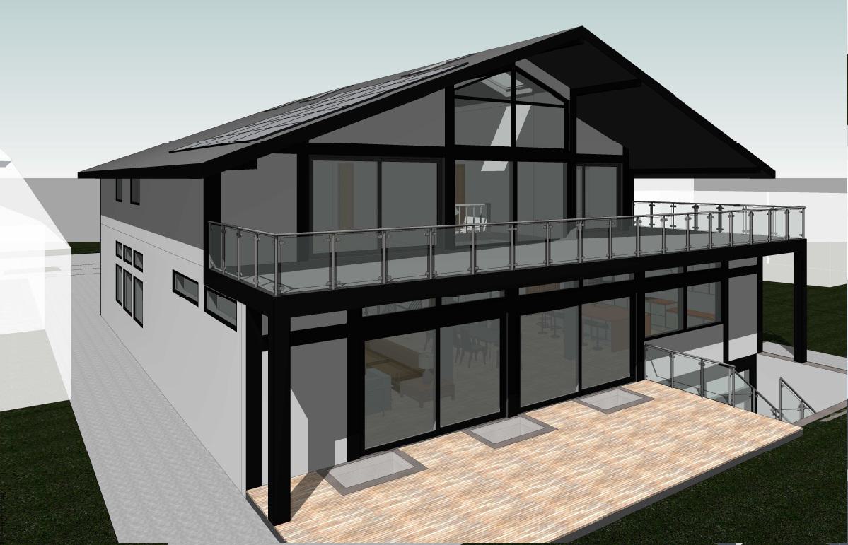 Another exciting and unusual project for a discerning couple who chose Kingspan Timber Solutions for their full and comprehensive package. This included the erection service, cranage for offload and erection plus fall prevention system included, along with a higher specification and fuller package than the other quotes received. The clients realised that, when analysing lower cost quotes, they could see the lower specification frame, poorer package and less comprehensive erection service. These Architect's models show the proposed building and we are awaiting actual finished photos for comparison as the build nears completion. Particularly of note on this project was the collaborative working between the client, the Architects and the Kingspan Timber Solutions Design team. They worked together on areas such as the fitment over the full basement, the large roof overhang to create the covered terrace, the terrace detailing, and the contemporary nature of the design. It incorporated large glazed areas that needed a higher thermal specification for the external wall to offset the large glass areas.